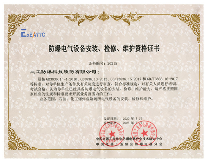 • 防爆設備安裝檢修維修資格..